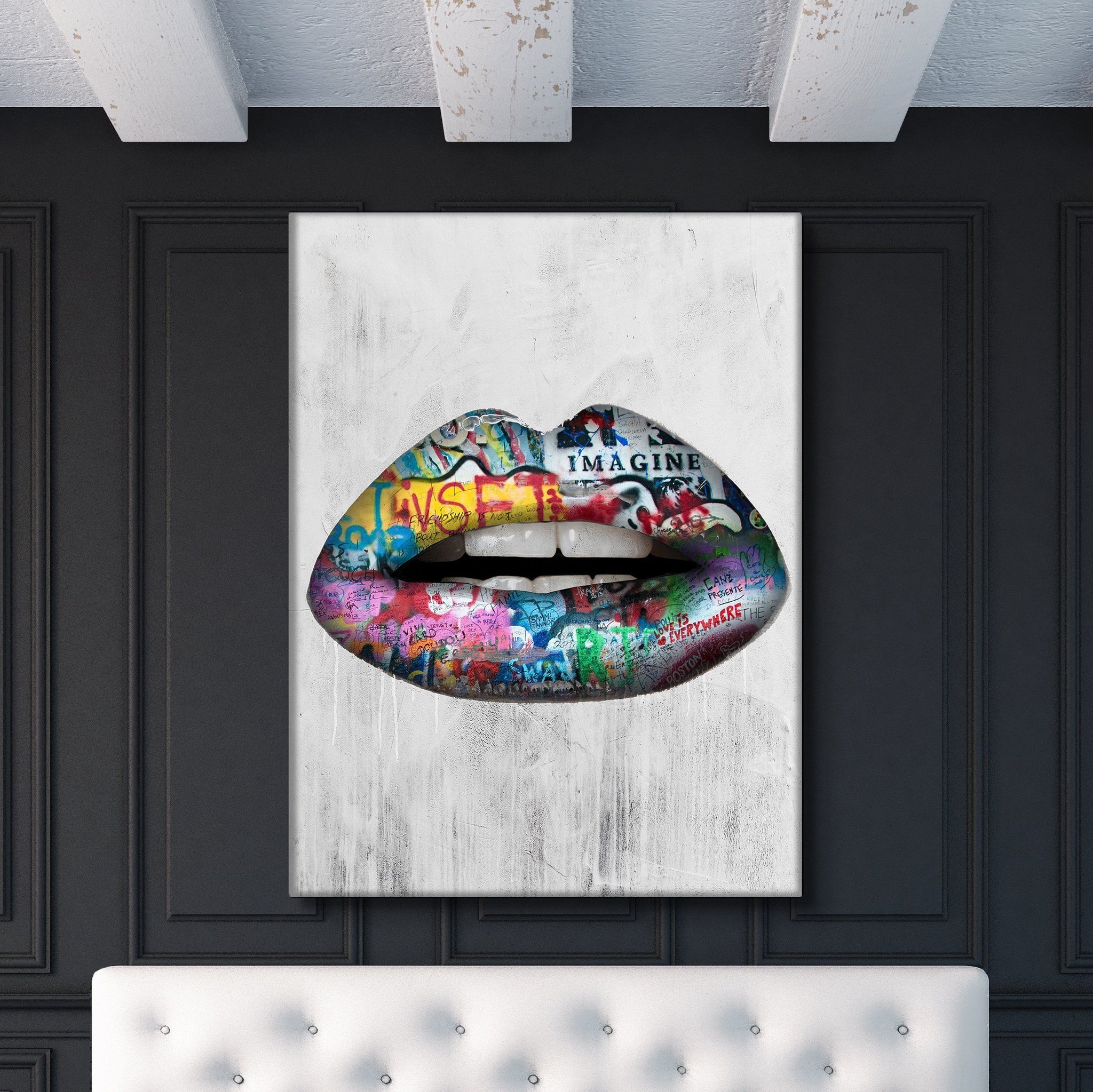 The the best lip kit money can buy, graffiti edition. Cultural celebrities and plastic surgeries have nothing on these luscious lips wall canvas. With multi-colors and a Banksy style design, there are endless possibilities of there this beauty can be hung up.